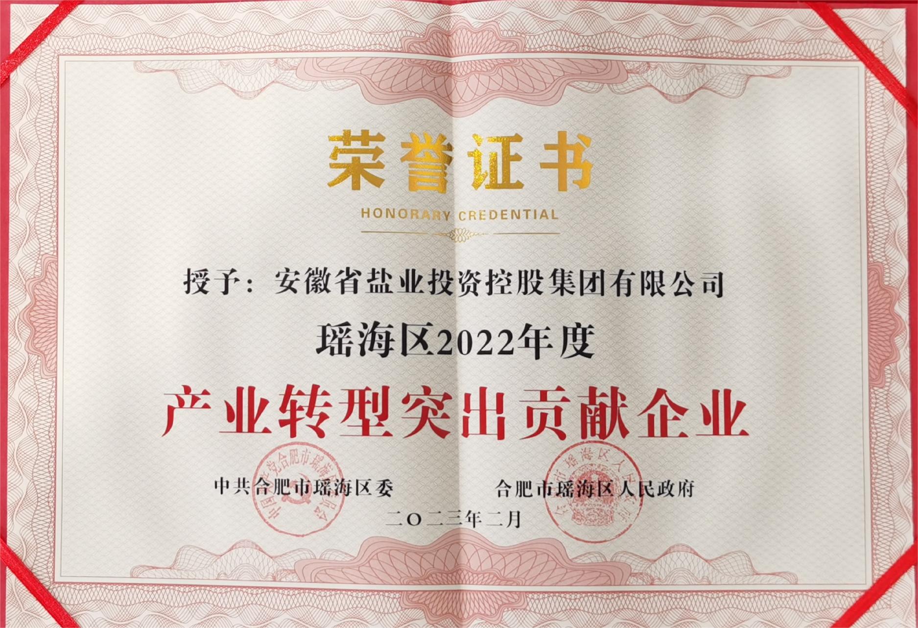 近日,省盐业获得瑶海区委、区政府授予的瑶海区2022年度“产业转型突出贡献企业”荣誉称号。