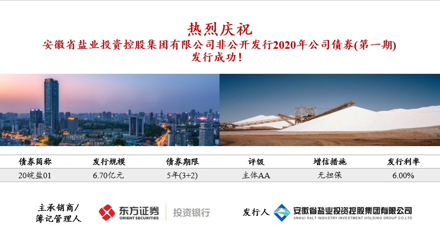 热烈庆祝安徽省盐业投资控股有限公司非公开发行2020年公司债券(第一期)发行成功!