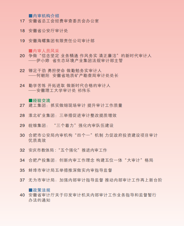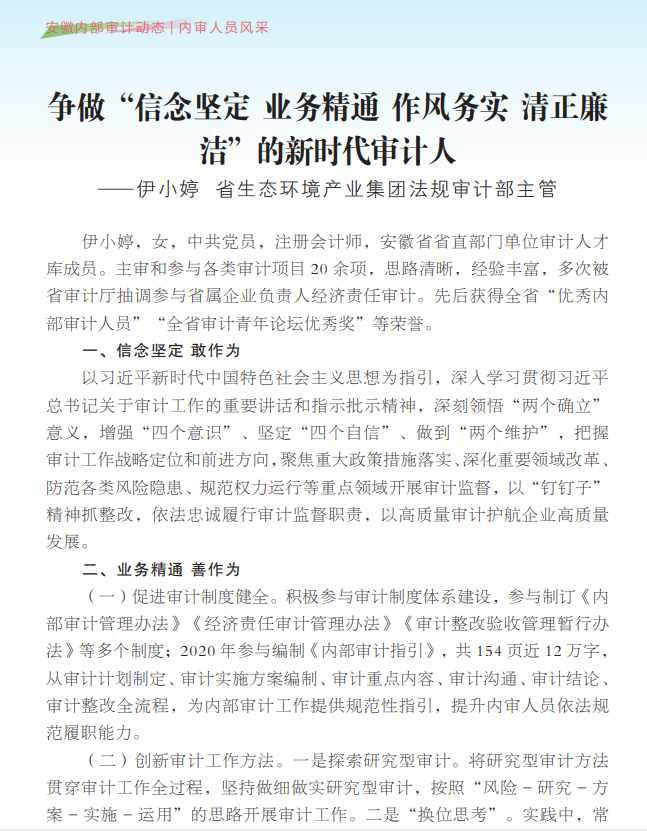 11月14日,公司法规审计部主管伊小婷同志被省审计厅编印的《安徽内部审计动态》第3期——“内审人员风采”栏目宣传报道。