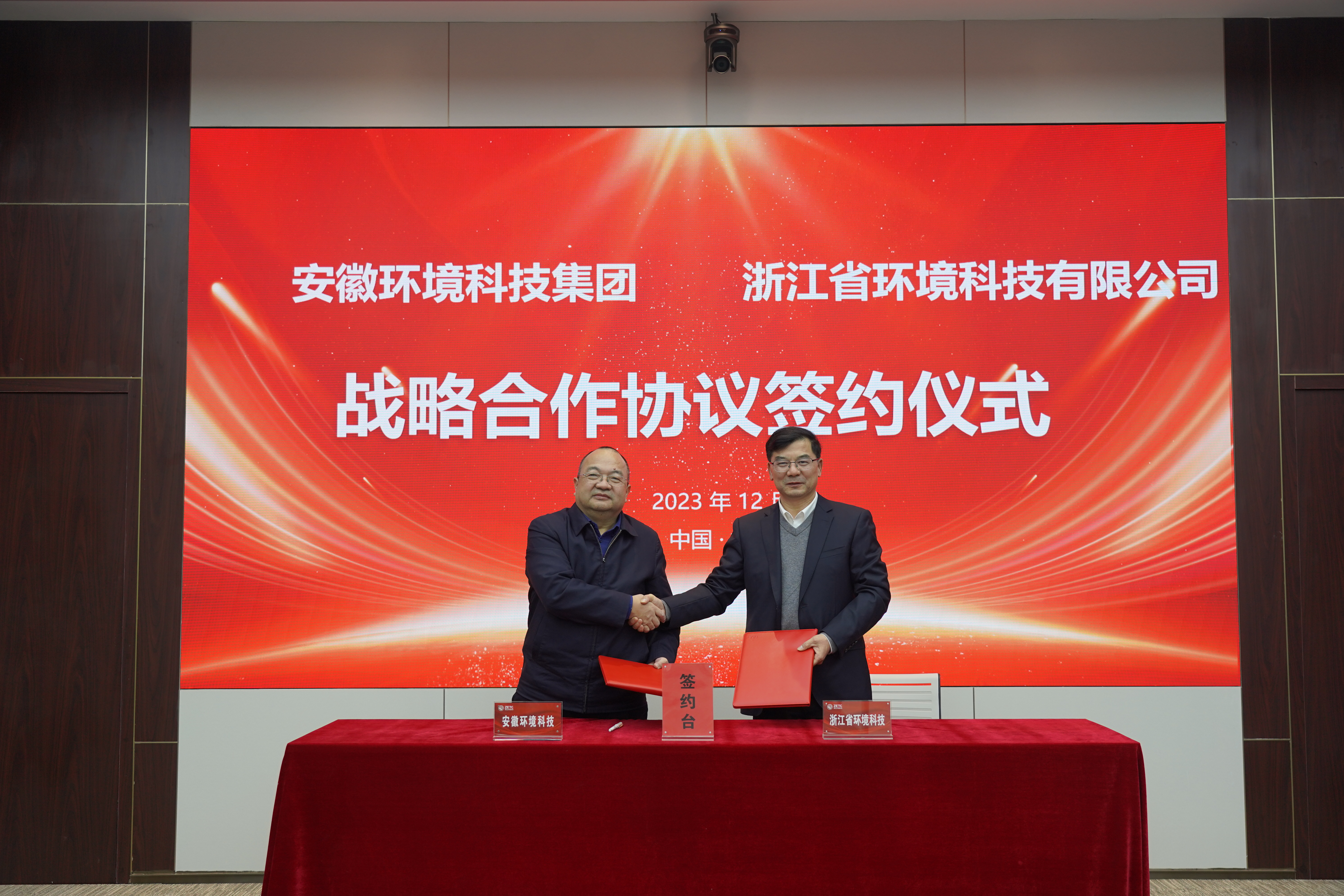浙江省环境科技有限公司党委书记、董事长韦彦斐,安徽环境科技党委书记、董事长方降龙代表双方签订战略合作协议。