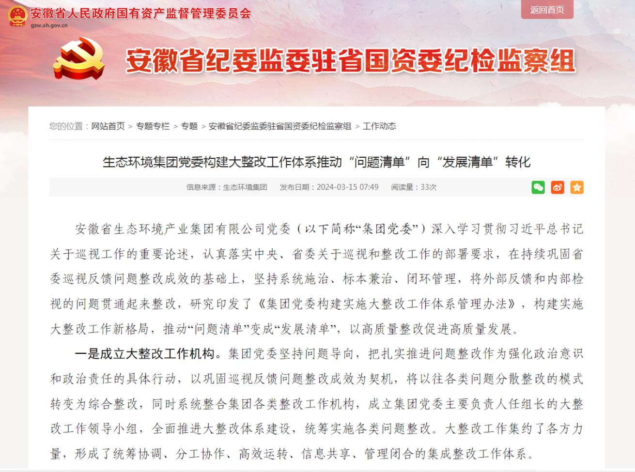 近日,安徽省国资委网站-安徽省纪委监委驻省国资委纪检监督组专栏发布了《省生态环境党委构建大整改工作体系推动“问题清单”向“发展清单”转化》,以下为全文。