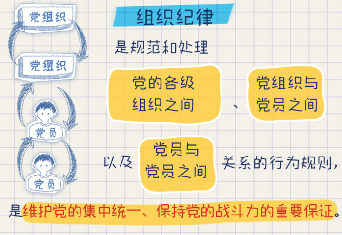组织纪律着眼于党员和党组织之间的关系,规范的是党组织和党员遵守和维护党在组织上团结统一的行为。一个人一旦入了党,就要有强烈的组织意识和组织观念,就必须严格遵守组织纪律。