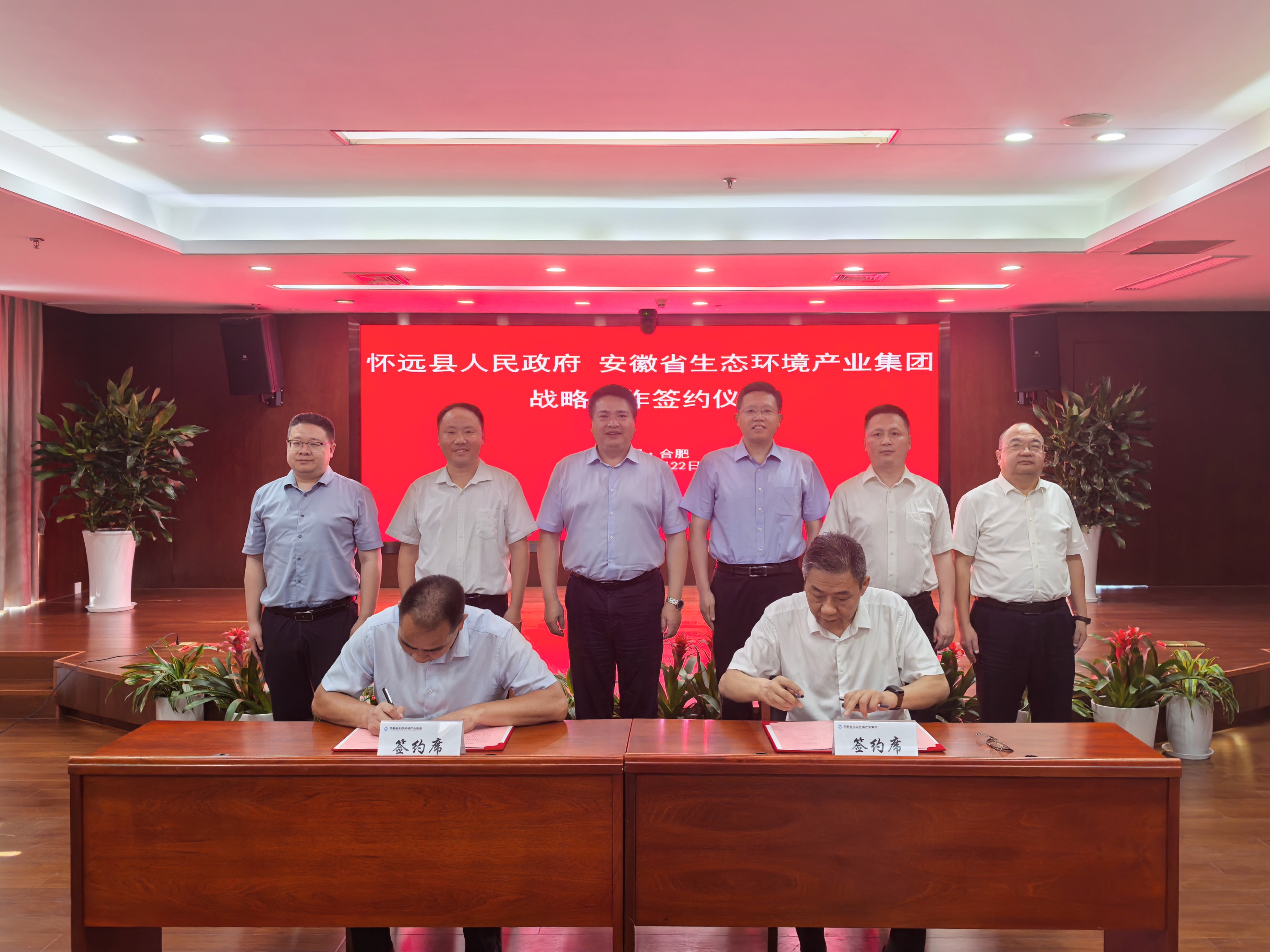 7月22日,省生态环境产业与怀远县签署战略合作协议。省生态环境产业党委书记、董事长罗太忠与蚌埠市委常委、怀远县委书记潘君齐出席签约仪式并见证签约。