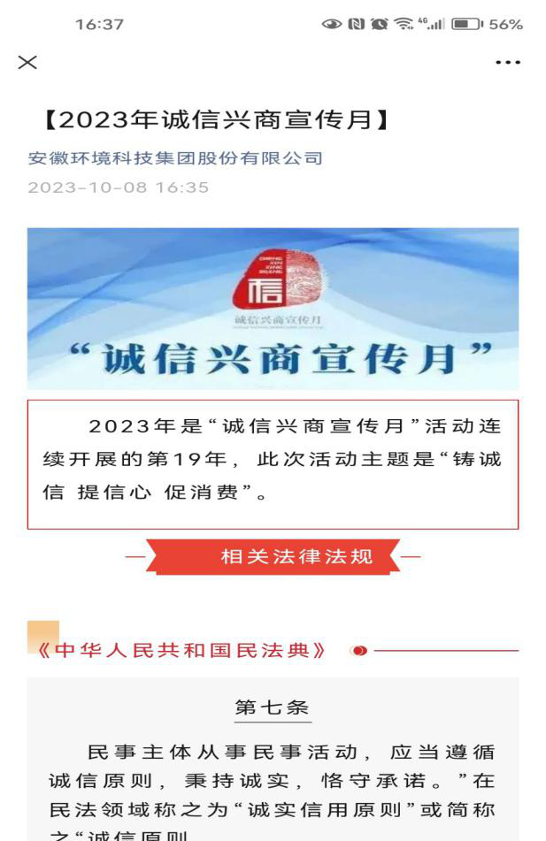 为进一步加强社会信用体系建设,弘扬诚信文化,引导企业增强诚信兴商理念,树牢诚实守信意识,省生态环境产业及各直属(控股)公司开展“诚信兴商”集中宣传月活动。