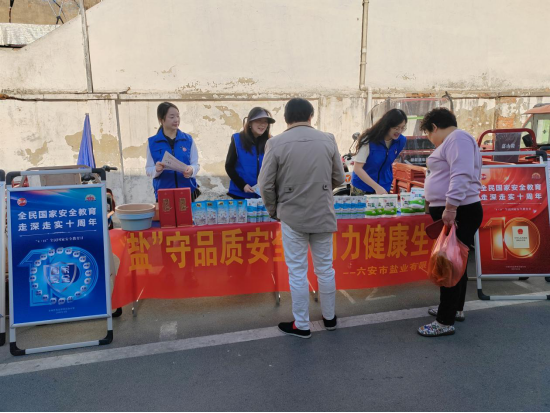 六安盐业公司党员志愿者走进开发区小庙农贸集市,设立普法宣传点,向居民宣传国家安全相关知识,普及食盐安全知识。