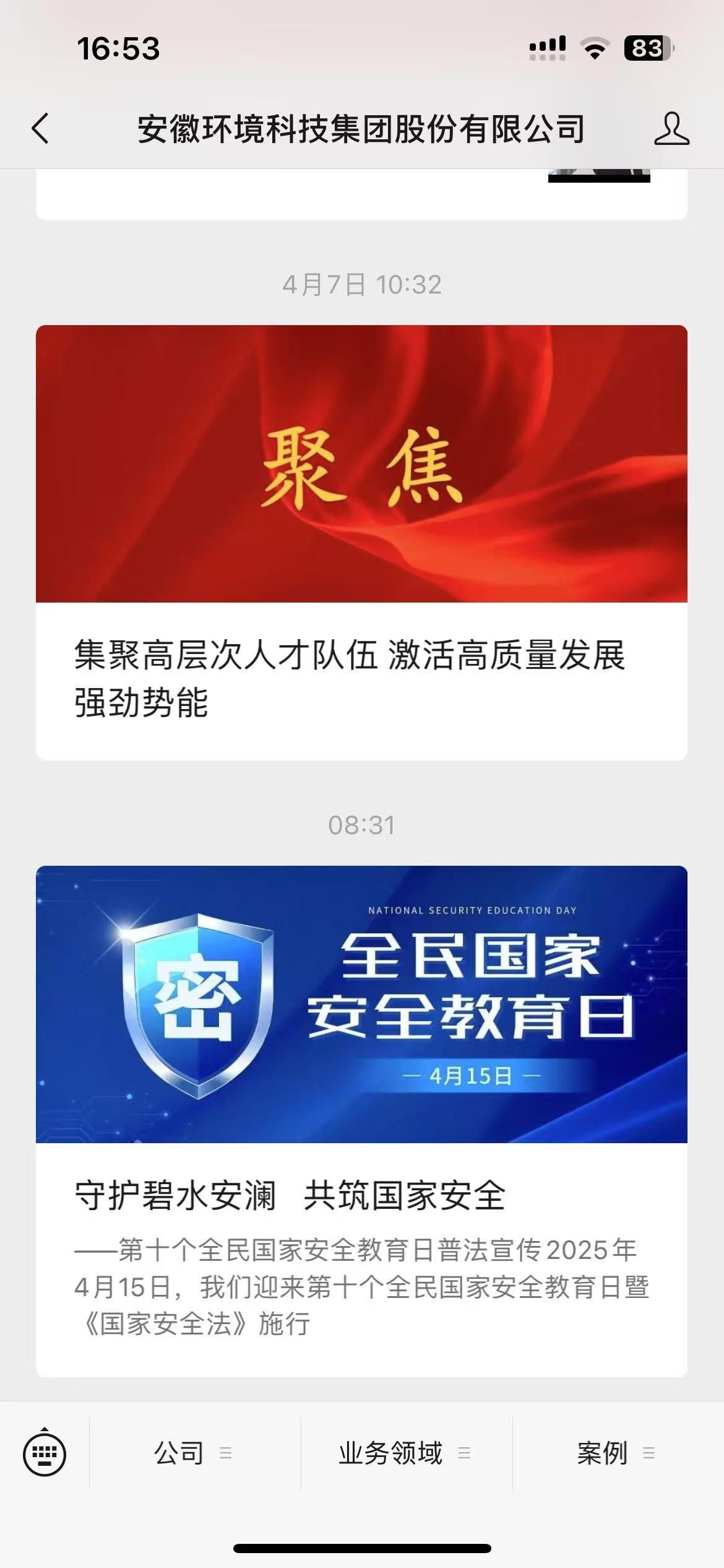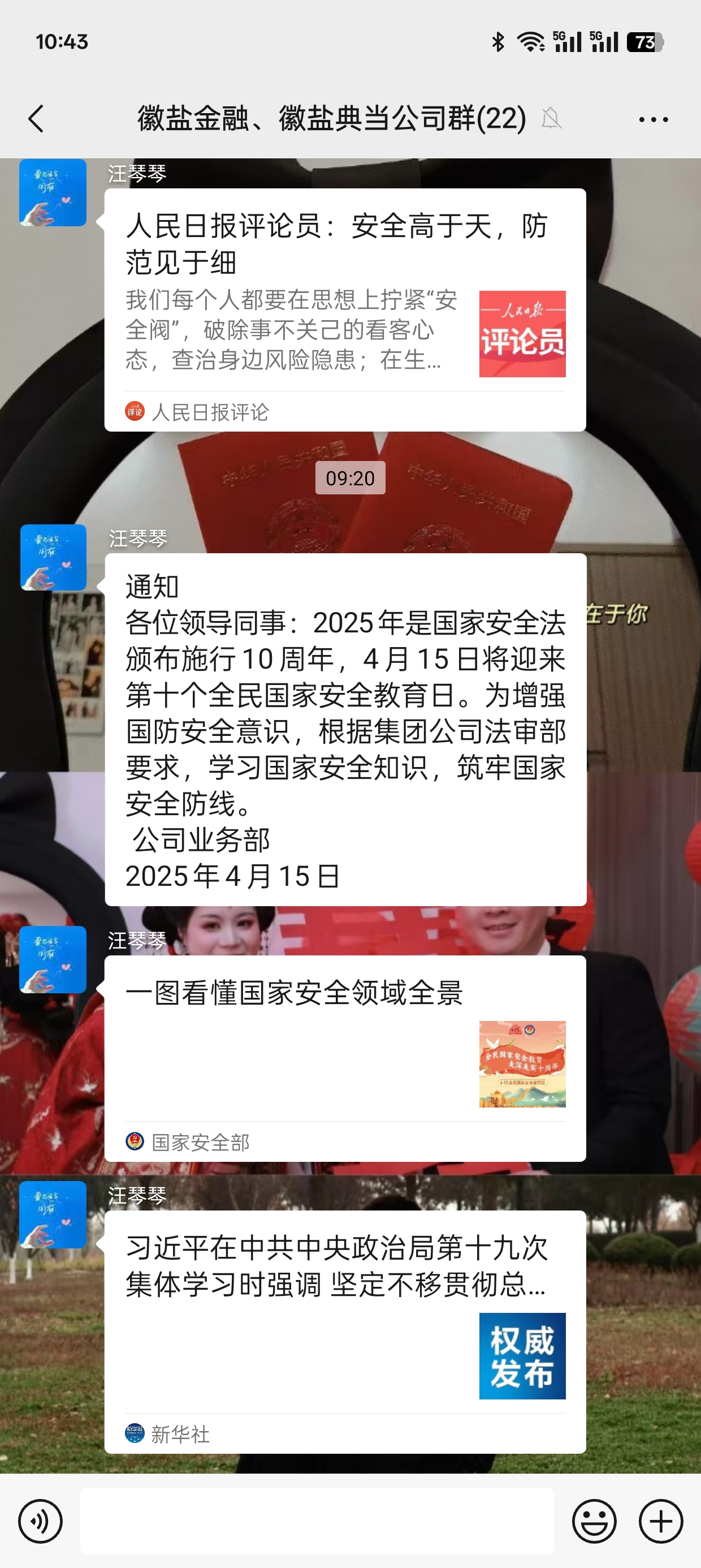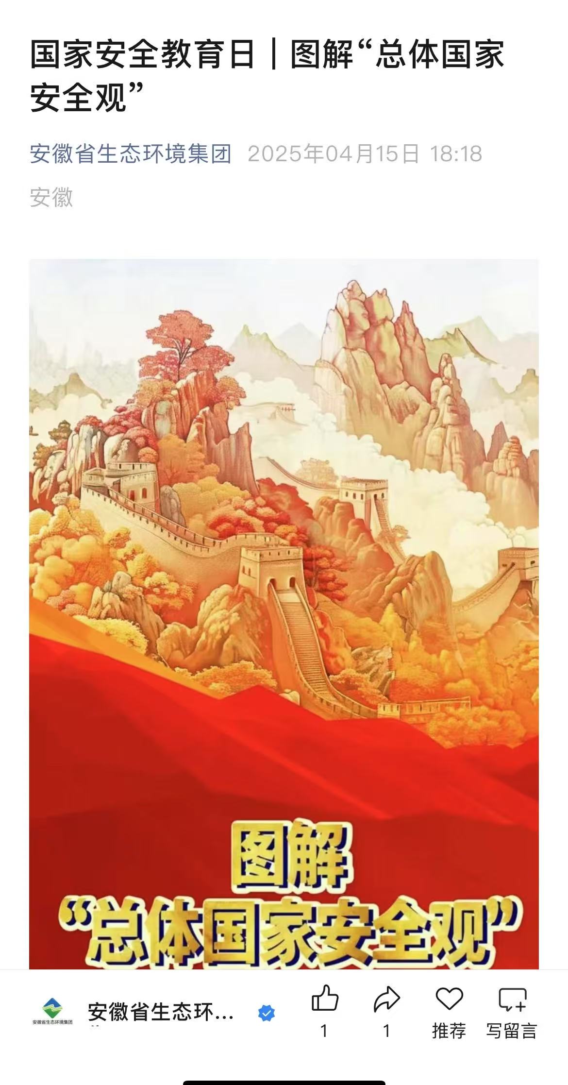 地产微信群每日推送国家安全知识图解、微视频,以“碎片化学习”提升普法渗透力;公司、环境科技微信公众号发布专题推文《国家安全,你我同行》,通过案例剖析、法条链接等形式,生动解读《国家安全法》《反间谍法》;徽盐金融等子公司组织线上答题活动,覆盖全员,以考促学巩固国家安全基础知识,参与率达100%。
