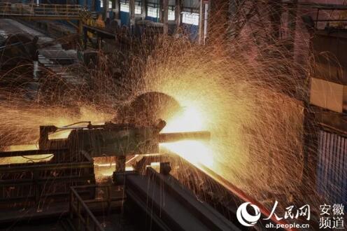 钢材切割时,四溅的火星犹如一幅画。图为马钢H型钢生产线。人民网 王晓飞摄
