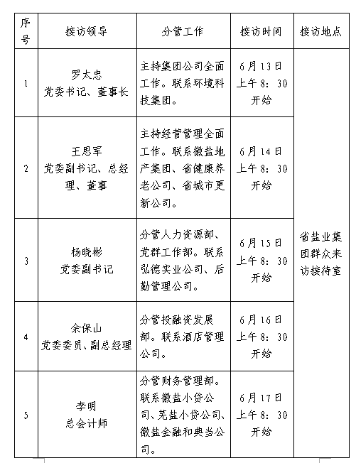 根据工作安排,现就省盐业领导班子成员6月份接待省盐业系统职工群众来访安排公示如下: