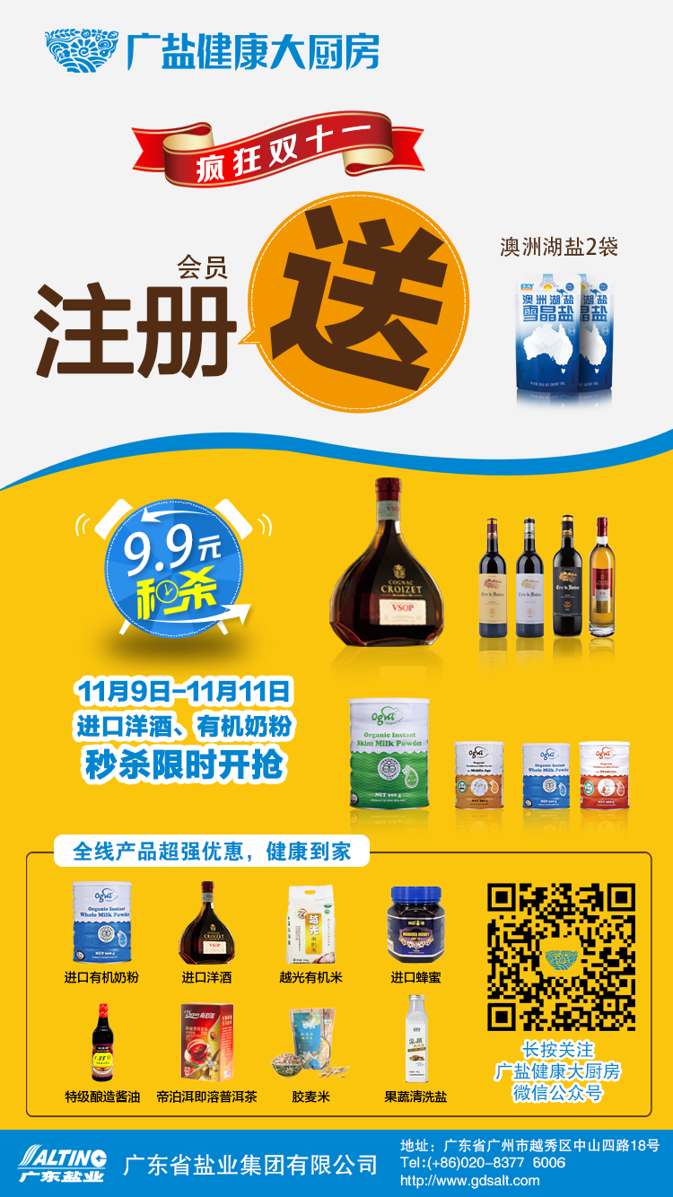 广东省盐业在11月组织开展全省统一的广盐健康大厨房“双11” 营销活动。活动期间,用户关注“广盐健康大厨房”微信公众号(微信号:gyjkdcf)并注册为会员的,每人均可免费获赠两包澳洲湖盐(250g),另外还有多款商品限时“9.9元秒杀”及全场打折优惠活动,活动详情及参与方式请大家关注广盐健康大厨房。