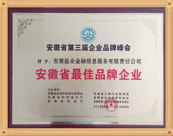 2016年6月18日,由安徽省经济和信息化委员会、安徽省科学技术厅、安徽省商务厅、安徽省工商行政管理局、安徽省企业品牌促进会,共同举办的“安徽省笫三届企业品牌峰会”在省人大会议中心举行。安徽盐业金融信息服务有限责任公司(简称徽盐金融)荣获“安徽省最佳品牌企业”奖项并受邀参加本次会议。