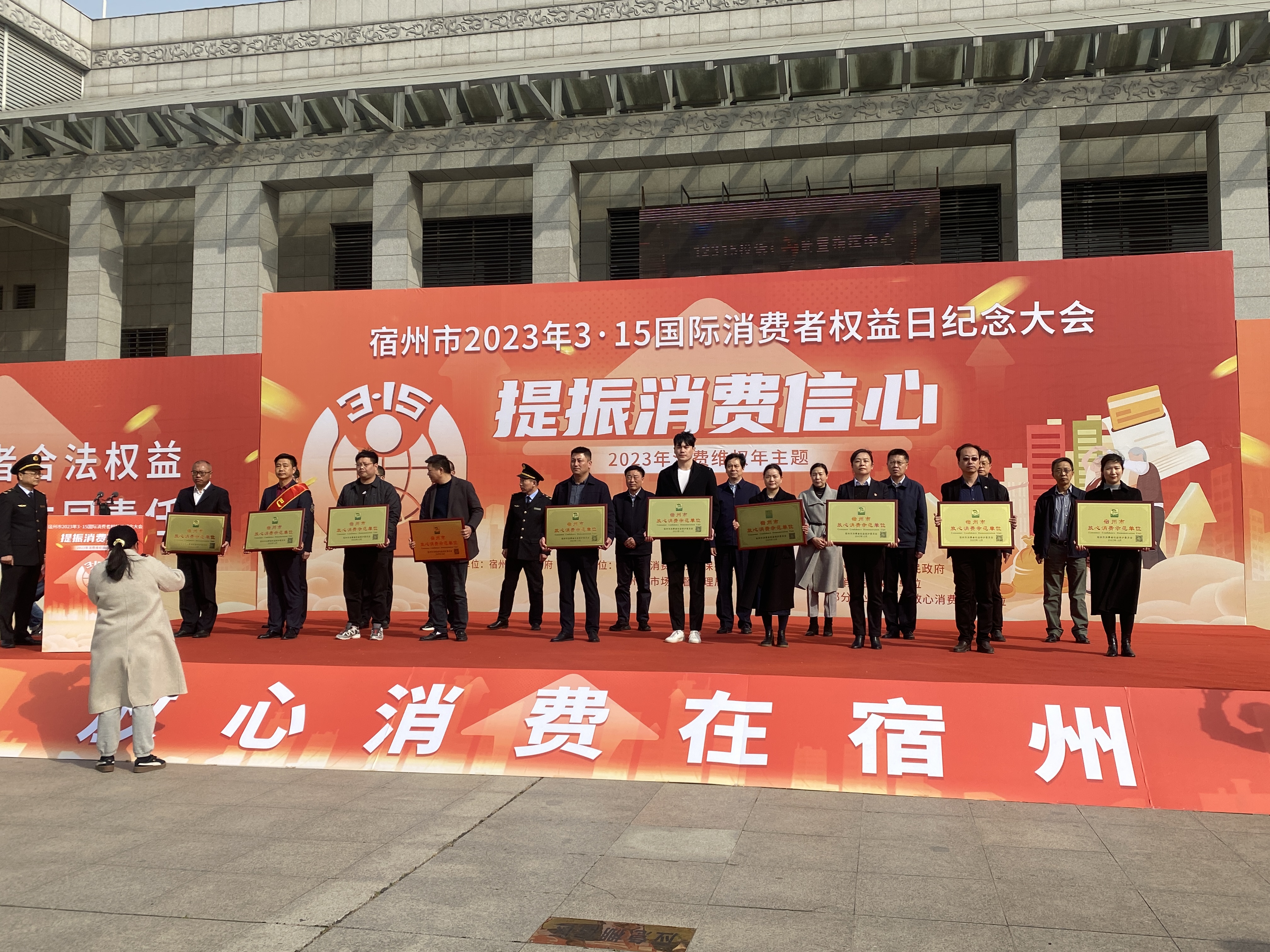 2023年3月15日,宿州市在银河广场举行3·15国际消费者权益日纪念大会,市人大常委会副主任、市消保委主任候家春参加开幕式,市政府副市长杨泽胜出席并讲话。参会领导为安徽宿州润淮汽车销售服务有限公司等10家荣获“2022年放心满意消费示范企业”称号的企业授牌。