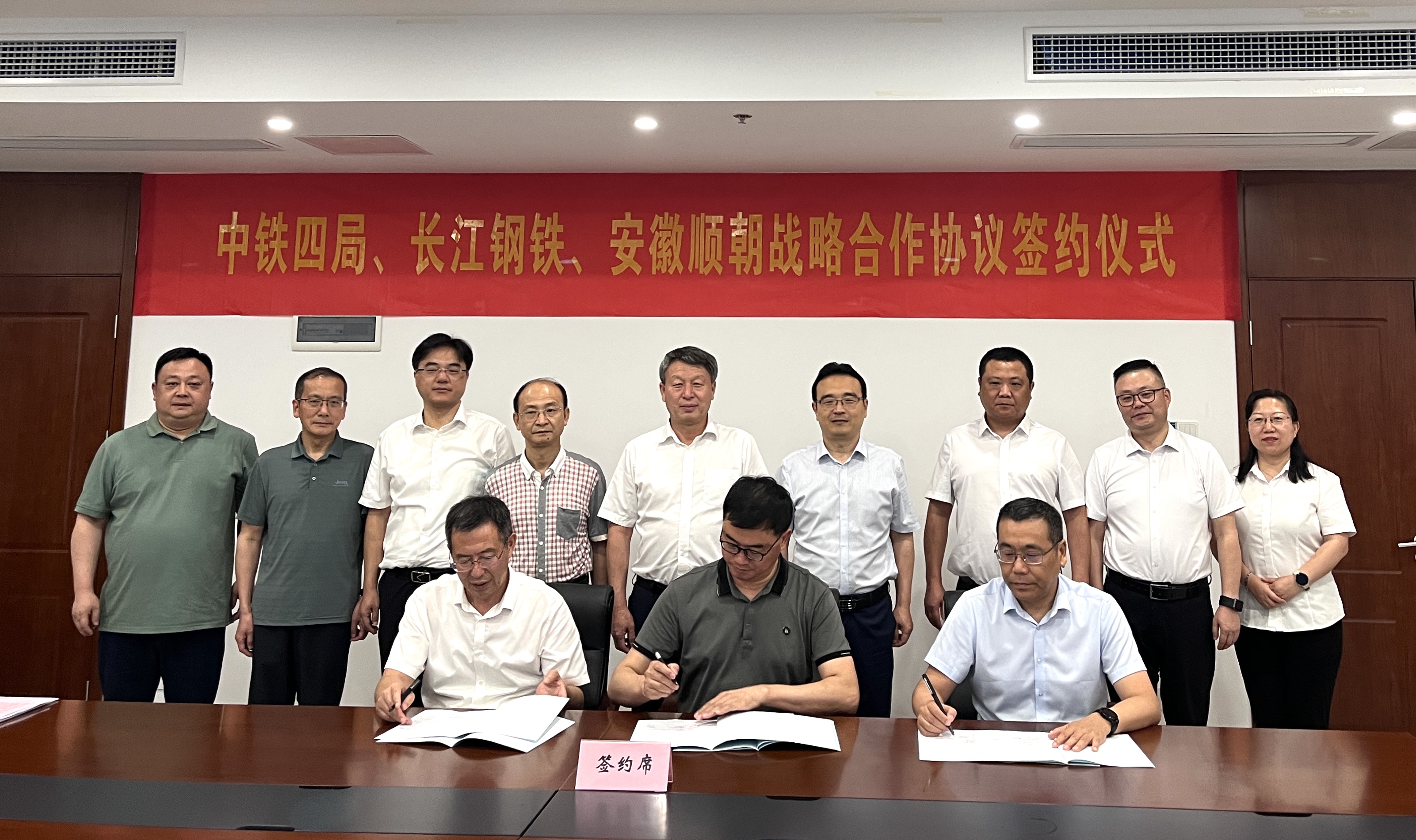 7月28日,顺朝公司与中铁四局有限公司、安徽长江钢铁股份有限公司签订战略合作协议。协议明确,三方在现有良好合作的基础上,将合作区域由合肥市等四个区域扩大至安徽全省。同时,三方将基于互惠互助的信任关系,积极推进钢铁领域的各项合作和业务发展,实现资源共享、优势互补、降本增效。签约仪式上,三方还就电子商城、网络物流、废钢回收等多领域的未来合作展开深入交流。