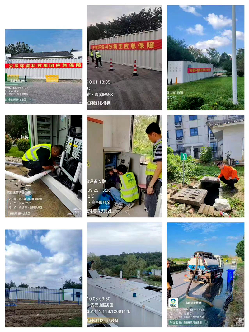 2023年中秋、国庆假期,是安徽省生态环境产业挂牌后的第一个长假。为确保全省高速服务区污水处理项目假日期间稳定达标运营,保障人民群众舒心出行,环境公司针对全省高速服务区高人流量、高运维压力的特点,制定两节期间运维巡检方案和巡检值班表,抽调本部与各子项目公司30余人协同作战,在人流量大和生态敏感区的重点服务区安排专人驻场负责污水站点运维,在各站点提前储存药剂和维修物品,同时紧急调配三台一体化设备安装在寒亭、香铺、清溪三个大流量服务区以策万全。