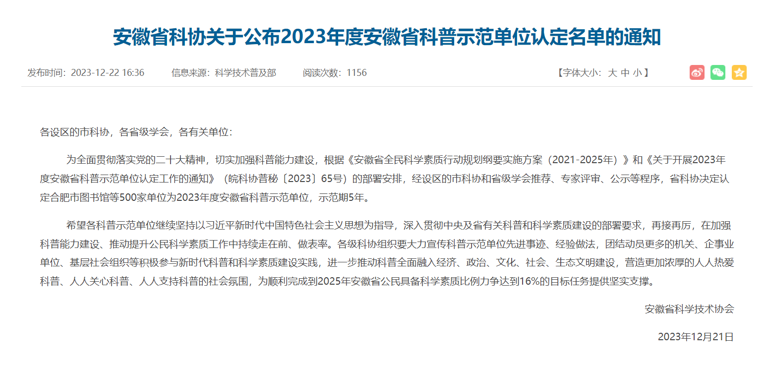 为全面贯彻落实党的二十大精神,切实加强科普能力建设,根据《安徽省全民科学素质行动规划纲要实施方案(2021-2025年)》和《关于开展2023年度安徽省科普示范单位认定工作的通知》(皖科协普秘〔2023〕65号)的部署安排,经设区的市科协和省级学会推荐、专家评审、公示等程序,安徽省科协决定认定安徽省合肥市盐业有限公司为2023年度安徽省科普示范单位,示范期5年。