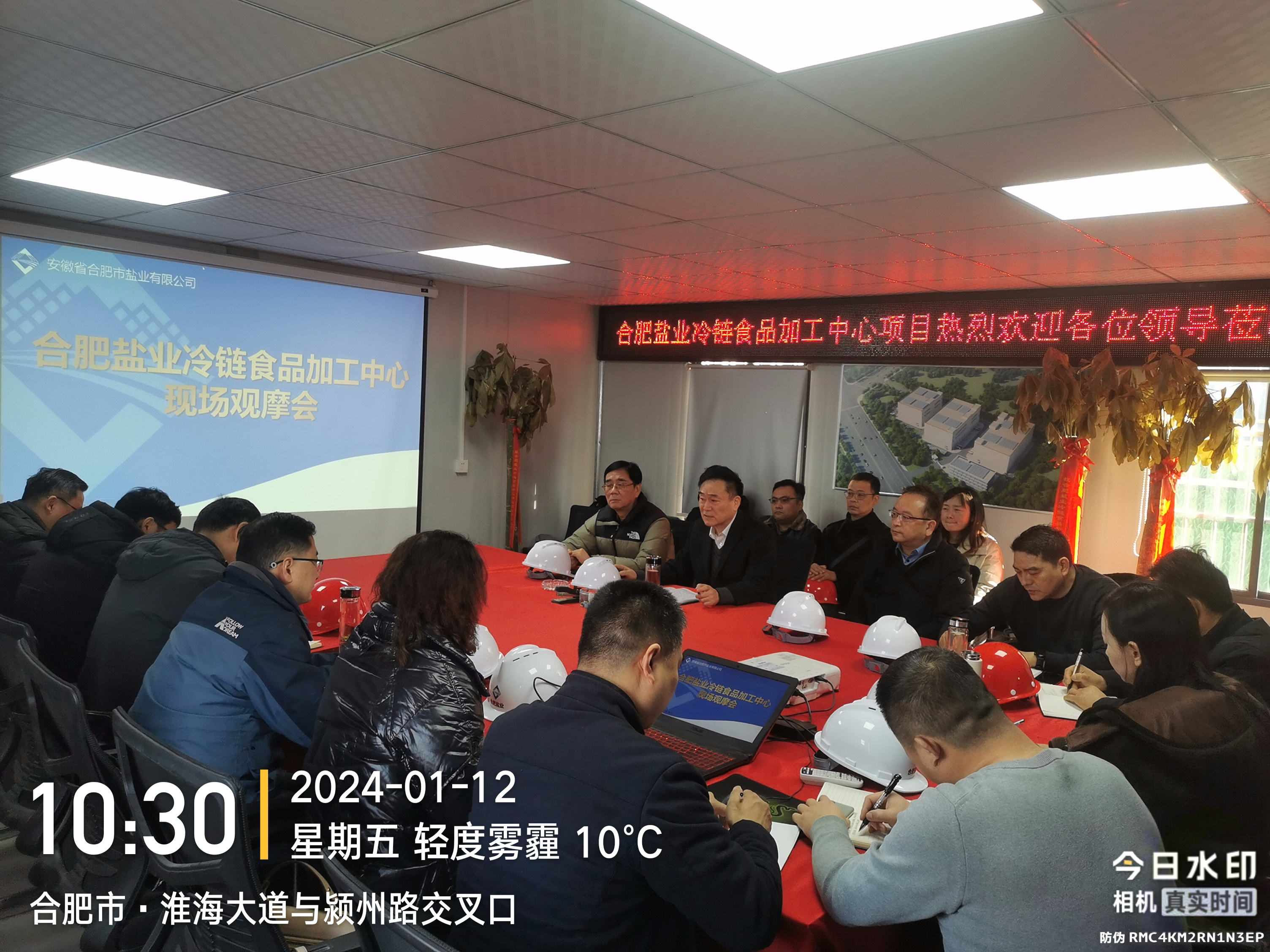2024年1月12日上午,合肥盐业冷链食品加工中心现场观摩会暨安全生产调度会在新站区高新技术开发区项目建设基地召开,会议由合肥市盐业公司党委书记、董事长、经理张鹰主持,省盐业公司副总经理江南及运营部相关人员、合肥市盐业公司领导班子成员、本部中层管理人员及所属各县(市)公司领导班子成员参加。
