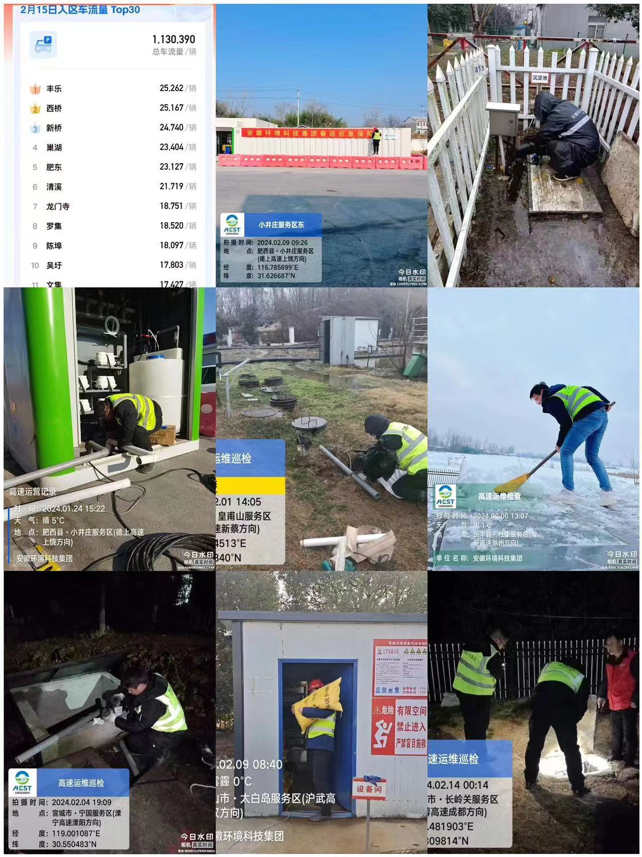 春运期间,安徽高速部分服务区超历史最大客流量,针对污水超量严重的服务区,环境科技公司统筹安排,将高速服务区污水外运至附近项目公司场站进行处置。除夕至年初一期间,环境科技公司利用高速客流短时回落的窗口期,紧急协调调试检修设备,确保返程高峰期运维服务质量。年初五夜间,由外单位负责运维的陈埠服务区突发泵站故障,接到协助请求后,环境科技公司不讲条件,连夜组织运维人员赶赴现场,迅速完成抢修,以实际行动践行国企担当。