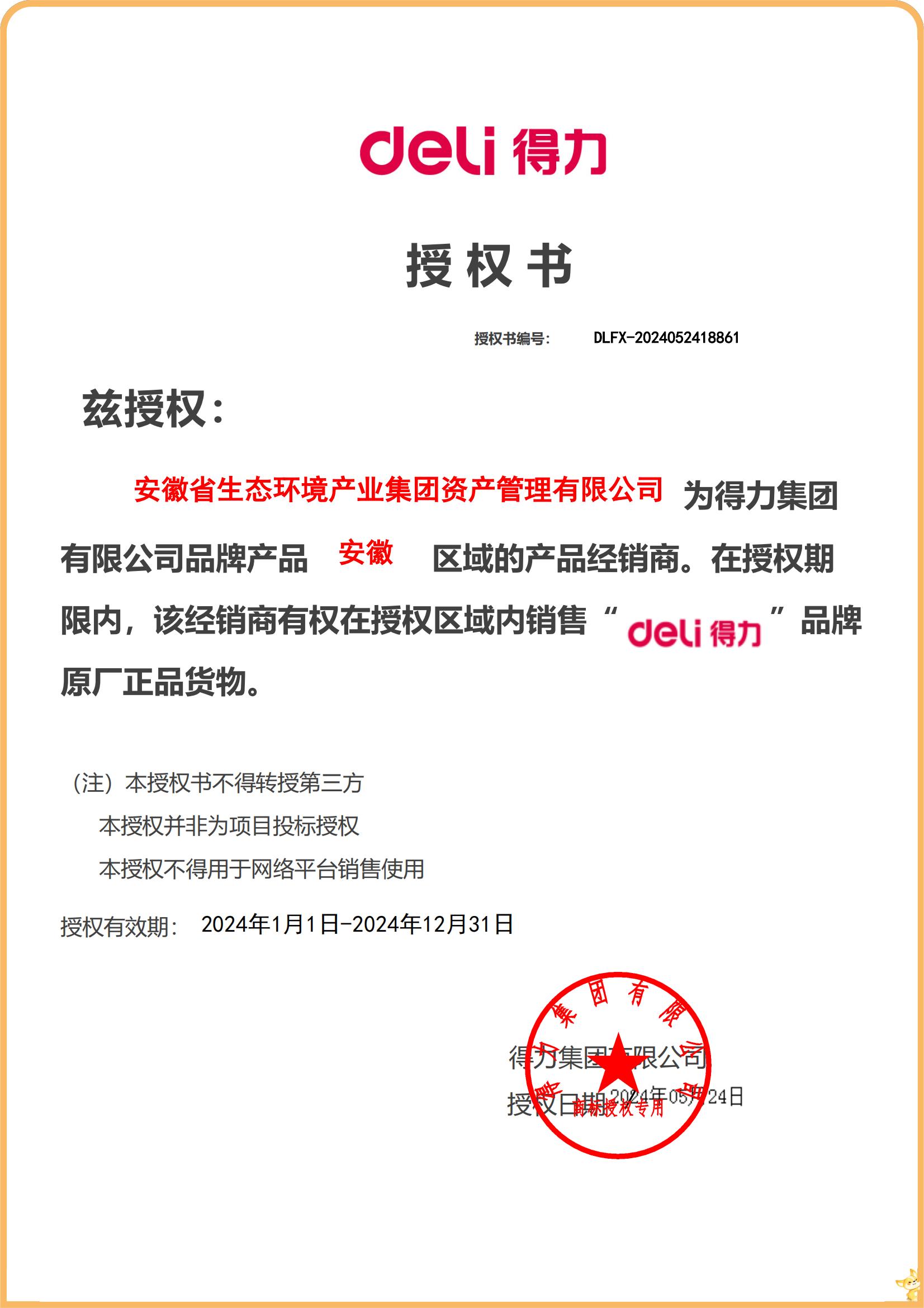 经过不懈努力,5月24日,省生态环境产业资产管理公司获得中国最大的办公与学习用品产业即得力的官方授权。