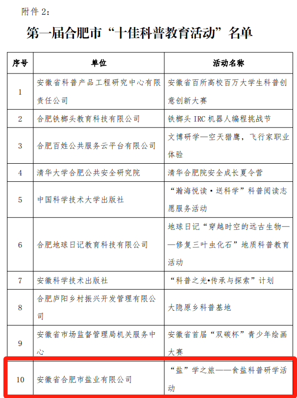 近日,由合肥市科普产业联盟举办的第一届合肥市“十佳展品”“十佳科普教育活动”“科普产业领军人物”评选结果公布,合肥盐业“盐”学之旅——食盐科普研学活动荣膺第一届合肥市“十佳科普教育活动”。